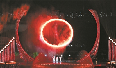 礼花绽放,映照欢庆海洋;圣火耀空,点燃万千豪情。