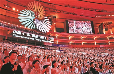“同心圆”上,南狮腾跃、粤剧悠扬,鱼灯摇弋、英歌飒爽……当智能机器人敲响千年青铜器,当“小蛮腰”与维港、大三巴梦幻联动,当经典粤语歌曲引发全场共鸣,岭南文化的深厚底蕴与大湾区的现代活力相得益彰,湾区同心的豪情与爱国热情、奋斗激情交汇激荡。