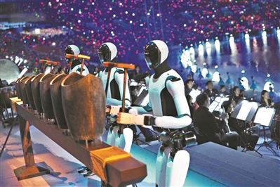 开幕式上的机器人敲响青铜句鑃。新华社发
