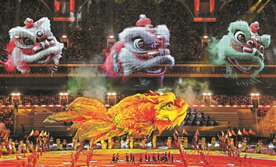 开幕式上,醒狮表演的狮头AR特效成为一大亮点。 新华社发
