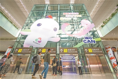 白云国际机场T2航站楼电梯塔楼的全运会吉祥物墙绘充满活力。(资料图片)广州日报全媒体记者李波摄