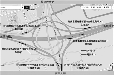 放马收费站出入口匝道实施全封闭施工,广中江高速主线往放马收费站方向匝道出入口、东新高速东沙方向和新联方向往放马收费站匝道出入口实施全封闭施工作业,禁止所有车辆通行(辖区高速公路管理、施工车辆除外)。