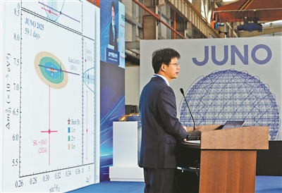中国科学院高能物理研究所副所长、JUNO合作组物理分析负责人温良剑报告了JUNO的首个物理成果。通过对今年8月26日至11月2日共59天有效数据的分析,JUNO合作组测量了被称为“太阳中微子振荡参数”的混合角θ12和质量平方差Δm212,比此前实验的最好精度提高了1.5—1.8倍。