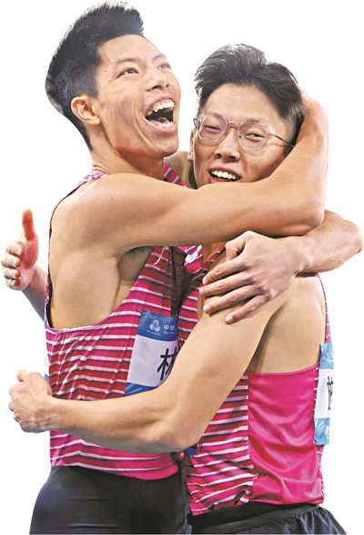 11月19日,十五运会田径项目男子200米决赛现场,广东队选手施君豪(右)和队友林健豪在赛后拥抱庆祝。他们分获冠军和亚军。 广州日报全媒体记者杨泽彬 摄