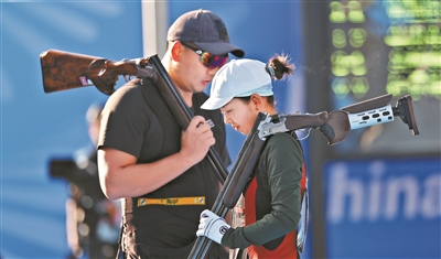 11月15日,广东队组合窦旭阳/车雨霏(右)在射击项目比赛中。 新华社发
