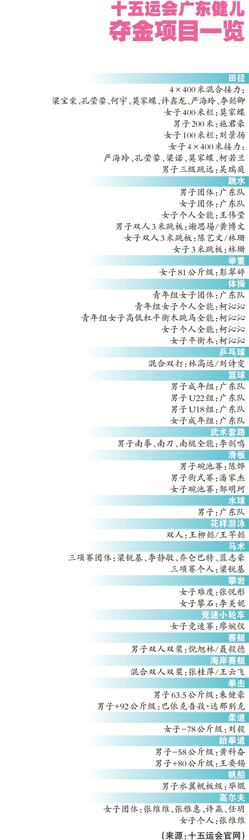 谢思埸克服伤病困扰,夺得跳水男团和男双3米跳板2枚金牌;苏炳添领衔广东队出战田径男子4×100米接力决赛,最终以0.03秒之差错过领奖台,完成谢幕;38岁的竞走老将刘虹和31岁的搭档王凯华拼到极限最终获得马拉松竞走混合接力第四名;六度征战全运会的刘诗雯携手林高远,“诗和远方”上演精彩逆转,勇夺乒乓球混双金牌;花样游泳“双生花”王柳懿、王芊懿尽显力与美,顺利摘得双人项目金牌;第三次参加全运会的34岁老将李剑鸣稳健发挥,勇夺男子南拳全能冠军;广东马术队在顾兵、黄焯钦、梁锐基等老将带领下获得2金1银3铜。