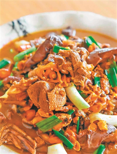 这是怎样一幅令游子惊艳的画面?鲜红欲滴的小米辣与浓翠如墨的线椒段铺陈在酱色的鹅肉之上,滚烫的红油还在咕嘟作响,升腾起的白色蒸汽瞬间模糊了游子们的视线。