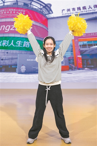 一套活力四射的啦啦操表演下来,听障舞者黄嘉淋的热情感染了在场所有人。黄嘉淋集多个标签于一身,不仅是啦啦操运动员,还是舞者、演员,参加了2008年北京残奥会开幕式表演《星星你好》,2017年主演的《花开的声音》获得腾讯全国公益微电影大赛特别奖、南粤金影奖“最佳演员奖”。黄嘉淋还参加了8月份在广州举办的第十二届残特奥会旱地冰壶项目的测试赛,并拿到第3名。在本次活动现场,黄嘉淋用手语展示自己的内心世界:“我不断拓展自己的边界,用心诠释每一个角色。未来我会继续热爱生活,秉持初心,不断挑战自我,用心追逐梦想,用手语与舞蹈绽放人生的精彩!”在被问及本次十五运会和残特奥会在粤港澳三地举办的感受时,黄嘉淋表示,赛事氛围非常热烈,她特别喜欢相关宣传标识及海报的配色,感觉眼前一亮。对于残特奥会,她表示肯定会到现场观看比赛,她最爱看游泳和田径比赛,希望参赛选手们都能赛出水平,创造佳绩。