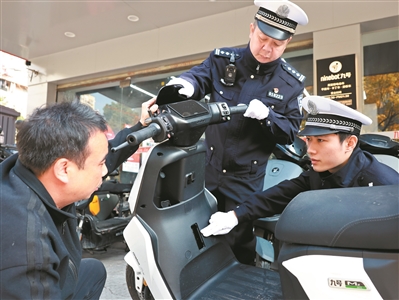 12月1日,某交通管理大队民警给销售人员宣讲“旧国标”电动自行车停售政策。新华社发