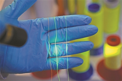 研究院研发出AIE荧光防伪油墨、AIE荧光纤维、锂电池隔膜聚合物微球黏结剂、光学树脂、贵金属富集材料等产品。王志明介绍,在防伪油墨方面,研究院正与青岛一家酒企合作开展防伪标志的研发,AIE荧光防伪油墨由树脂与AIE分子经特殊工艺制成。在日光下,印品呈无色或浅色,在365nm紫外光照射下则呈现强烈的荧光色,可用于各种商品防伪。AIE荧光纤维在自然光下呈现白色或彩色,经365nm紫外光激发后可发出强烈的荧光色彩,具有荧光亮度高、耐水洗性能好,适用纤维材料广等优点,可应用于织物服装、证券票据等领域的防伪。