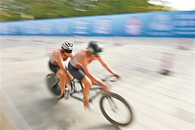 11月28日,广东肇庆砚阳湖畔,残特奥会铁人三项混合接力,视障运动员在引导员的带领下完成骑行环节比赛。