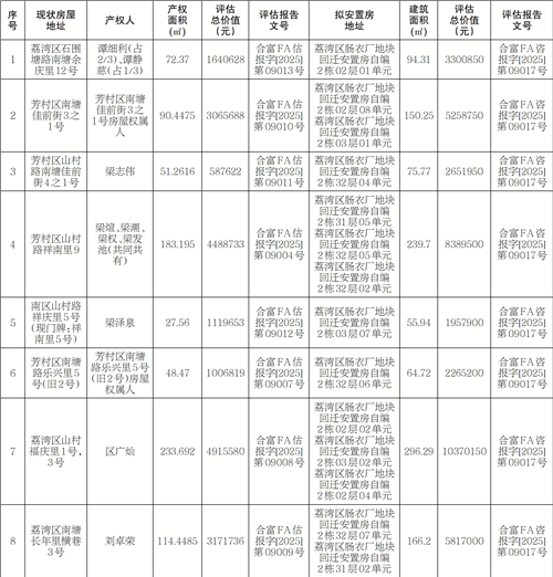 我办于2025年11月19日及25日对以下8间房屋及拟安置房屋的房地产价值评估结果进行了公告。经核查,上述8间拟安置房屋评估总价值结果存在笔误,现予以更正后并公告如下: