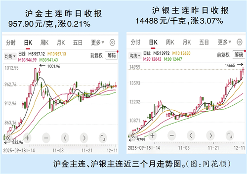 在美联储主席鲍威尔举行新闻发布会期间,现货白银刷新历史高位至61.9507美元/盎司。国内方面,截至12月11日收盘,沪金主力合约报957.9元/克,日内涨超0.2%,沪银主力合约报14488元/千克,日内涨超3%。