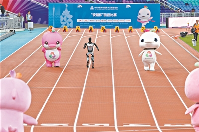 在十五运会田径比赛暖场环节,机器人与吉祥物赛跑。