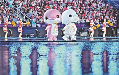 喜洋洋和乐融融在十五运会开幕式现场表演。新华社发