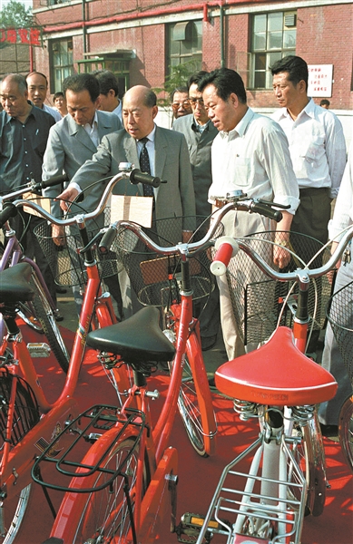 1990年6月3日,王丙乾同志在天津自行车厂考察。 新华社发