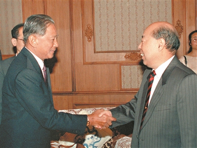 1994年5月10日,王丙乾同志在北京钓鱼台国宾馆会见由主席巴攀·杜巴德米率领的泰国上议院军委会代表团。 新华社发