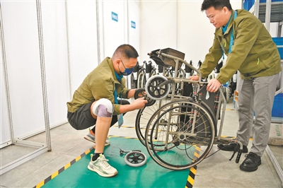 在康复辅助器具保障服务站,佩戴假肢20余年的维修技师孙勇,每天乘公交车早早抵达场馆,在工作台前坚守11个小时。他不仅为运动员维修损坏的假肢配件、更换变形的轮椅轮圈,更以“过来人”身份分享实用建议,用自身经验为残障运动员送去温暖与支持,完成了从被服务者到服务者的温暖传承。