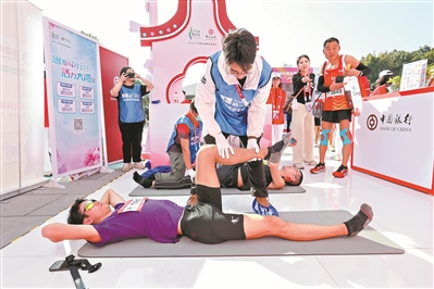 在中国银行赛后服务区里,专业按摩师正在为跑者进行按摩拉伸。