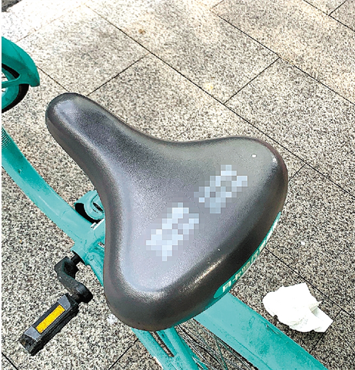 部分共享自行车坐垫上被白漆喷上了小广告,影响市容市貌,还涉嫌违法。