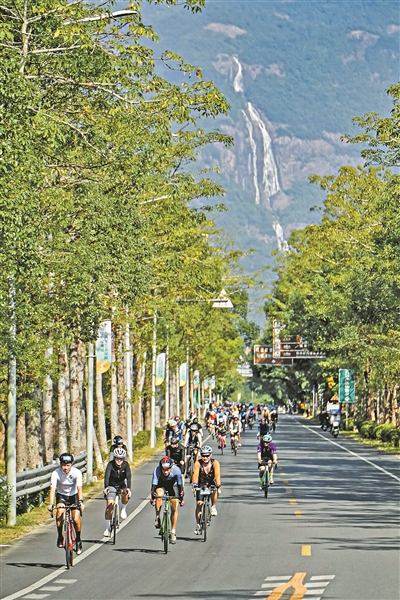 2025中国自行车运动骑游大会,选手在增城派潭绿道上骑行。