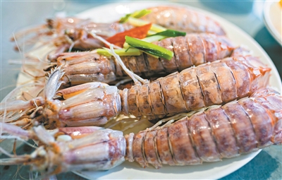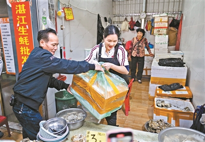 在新记海鲜档口,一位阿叔一眼相中刚开箱的湛江皮皮虾,“一只虾有手掌那么大,脚还在动,很新鲜啊。”阿叔快速挑选了五六只买单。“这些是2两虾,30多元就可以买到这么靓的濑尿虾,以前卖到50多元。”档主梁女士说。