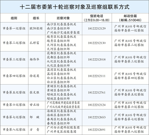 广州日报讯 (全媒体记者章程 通讯员穗巡宣)根据广州市委关于巡察工作的统一部署,十二届市委第十轮巡察各巡察组已于近日完成进驻工作。经市委批准,8个巡察组对全市11个区的纪委监委机关、组织部以及5家区属国企党组织开展提级巡察。