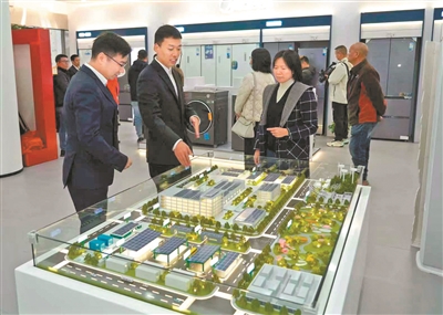 在产品展示区,一座精致的沙盘模型首先映入眼帘。它模拟的是某个工业园区的综合能源管理系统,光伏板、储能设备、充电桩、智能控制终端等微缩模型一应俱全。参观者可通过一旁的触控屏调节参数,实时观察能源流动与节能效果的变化。中央大屏上,滚动播放零碳示范项目、储能技术、智能控制等综合能源服务案例和关键技术介绍,将综合能源管理的“未来场景”清晰呈现。