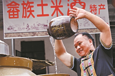 在畲族风情街,除了枇杷醋飘香,畲族米酒也香气扑鼻。蓝均玉打开一大缸,畲族米酒香气沁人心扉。酿造米酒是正果畲族祖祖辈辈传下来的习俗,畲族人称其“土莲香”。畲族村独特的地理环境赋予了米酒别样的风味。雷映霞介绍说,畲族村虽小,但有9家酿造畲族米酒的作坊。畲民坚持使用罗浮山泉水酿造,用木柴煮米,用陶罐发酵,让畲族米酒有“柴味”及“米香”,分外醇正。