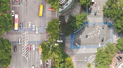 两个路口均增设非机动车专用信号灯、完善蓝色非机动车过街通道及等待区、完善隔离护栏,让市民骑行时有明确连续的非机动车通行时间路权和空间路权。交管部门通过对两个路口交通流量的全天候监测与大数据分析,智能设定相邻路口的动态信号配时方案,提升路口通行效率。
