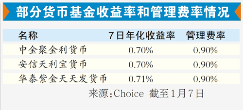 Choice数据显示,目前市场上共有965只货币基金,截至1月7日,7日年化收益率在0.37%~2.44%之间,平均水平约1.23%。