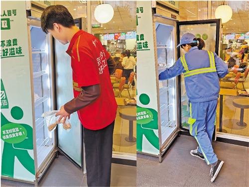 外卖骑手贾先生和环卫工人陈女士分别从冰箱中取走包装完好的余量食物。