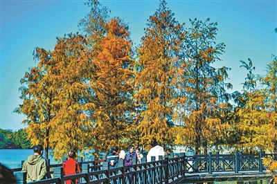 市民游客在海珠湿地欣赏美丽的落羽杉。