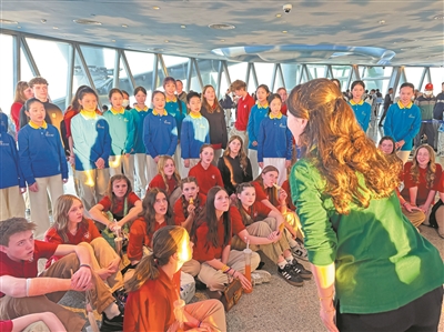 10日下午,合唱团成员登上广州城市地标——广州塔,站在城市之巅俯瞰,日新月异的城市风貌尽收眼底。在这里,他们与广州本地的青少年共同唱响了粤语经典歌曲《朋友》,在旋律中共筑友谊之桥。