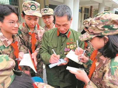 英模报告团成员为学校师生宣讲红色故事后为学生签名。