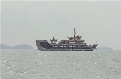 马六甲海峡中一艘仿郑和宝船的游船 摄/广州日报全媒体记者 骆昌威