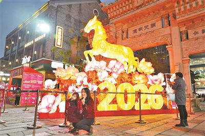 昨晚,市民在活动现场马年主题装置前留影。