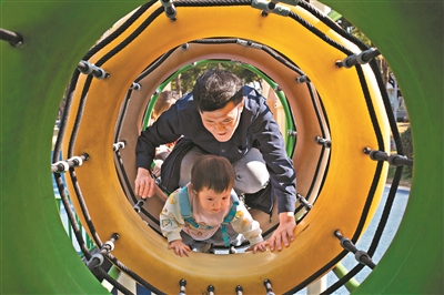 2025年12月16日,广州市二沙岛体育公园,静睿一边摸索一边陪同女儿念念玩钻洞的游戏。