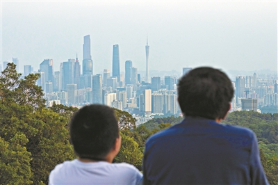 2025年8月13日,静睿(右)和暖暖的大儿子在白云山上凭栏远眺,8岁的哥哥在为静睿口述他所见的景色。