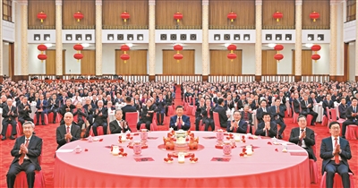 人民大会堂宴会厅灯光璀璨、喜气洋洋,各界人士2000多人欢聚一堂、共迎佳节,现场洋溢着欢乐祥和的节日气氛。