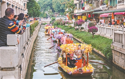 滨江花市、水上花市人潮如织