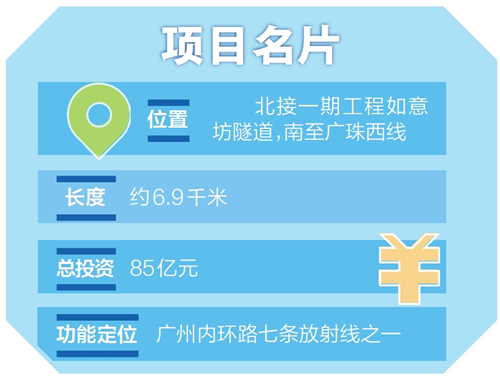 如意坊二期项目于2020年启动,是广州内环路七条放射线之一,北接一期工程如意坊隧道,南至广珠西线,全长约6.9千米,作为广州中心城区连通珠江西岸的快速通道、荔湾南片芳村的交通大动脉,建成后内环路至广珠西线通行时间将从30分钟以上缩短至10分钟,有效缓解交通压力、提升通行效率。