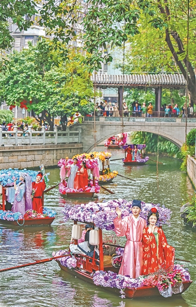 水上花市,装饰精美的花船在荔枝湾涌巡游。广州日报全媒体记者廖雪明 摄