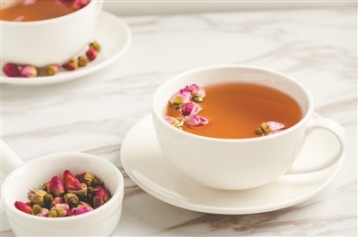 做法:(1人份)取玫瑰花6克(后下)、茯苓9克、炒薏米12克、陈皮5克、生姜2片,沸水焖15分钟,待水温降至90℃左右,加入玫瑰花,再焖3分钟,代茶温饮。上午服为宜。