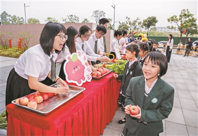 广州市培英中学科技城校区的老师们将象征平安的红苹果送到学生手中,送上新学期的第一声祝福。广州日报全媒体记者庄小龙 摄