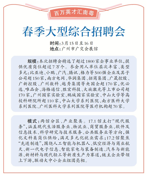 “百万英才汇南粤”2026年行动计划以“粤聚英才、粤见未来”为主题,将举办2场大型综合招聘会。除了即将于3月15日—16日在广州举行的春季大型综合招聘会外,还将于秋季在深圳举办另一场高规格的大型综合招聘会。