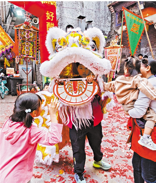 当日上午8时起,萧岗各片区醒狮队绕村巡游,穿行于联社大院、得朋书院、祠堂之间。沿途,村民争相触摸狮头“接福气”,孩童欢呼雀跃,街巷洋溢着浓浓年味。随着来自市内外的102条兄弟村携贺礼陆续抵达,“会狮”仪式频频上演,双狮匍匐碰头致意,传递传统情谊。
