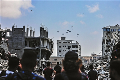 8月8日,飞机在加沙城上空空投物资。(新华社发 里泽克·阿卜杜勒贾瓦德 摄)