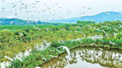 本报讯(通讯员张健珍何鉴清)近年来,我市生态环境持续向好,吸引了黑天鹅、白鹇等鸟类来此栖息。近日,郁南县建城镇东一村委梅花营村的田野间迎来一群特殊的“访客”——近百只白鹭在稻田与河岸间轻盈起舞,有的低空盘旋觅食,有的驻足梳理羽毛,洁白的羽翼与碧水青山相映成趣,勾勒出一幅和谐灵动的生态画卷。