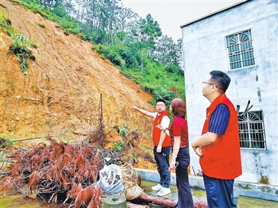 受前期台风雨影响,六都镇佛水村委单竹大围村发生房屋后山山体滑坡。因降雨持续暂不具备施工条件,六都镇政府及区自然资源局等部门协同应对,一方面认真组织“回头看”,深入单竹大围村滑坡点实地监测山体位移、裂缝变化等动态情况,全面掌握隐患发展态势;另一方面安排工作人员逐户走访周边群众,通过面对面讲解、发放避险明白卡等方式,提醒大家增强防灾意识和提高临灾避险能力。